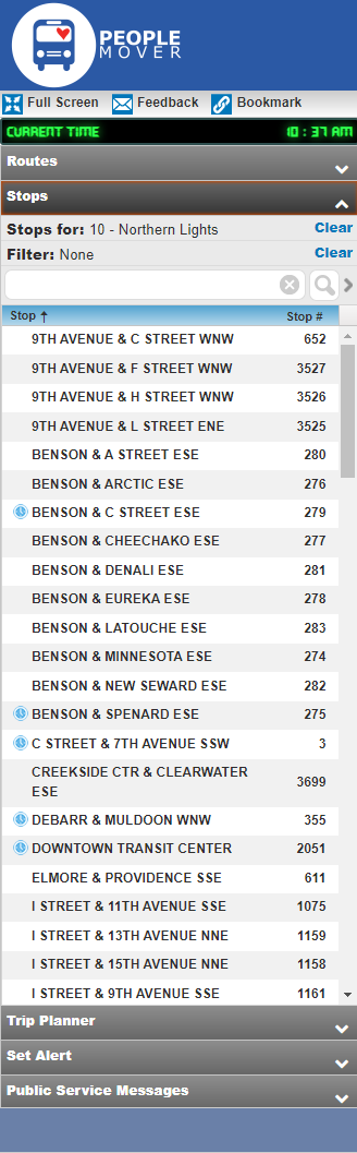 Selecting the “Stops" header in the lefthand navigation provides the complete list of bus stops along the selected route.